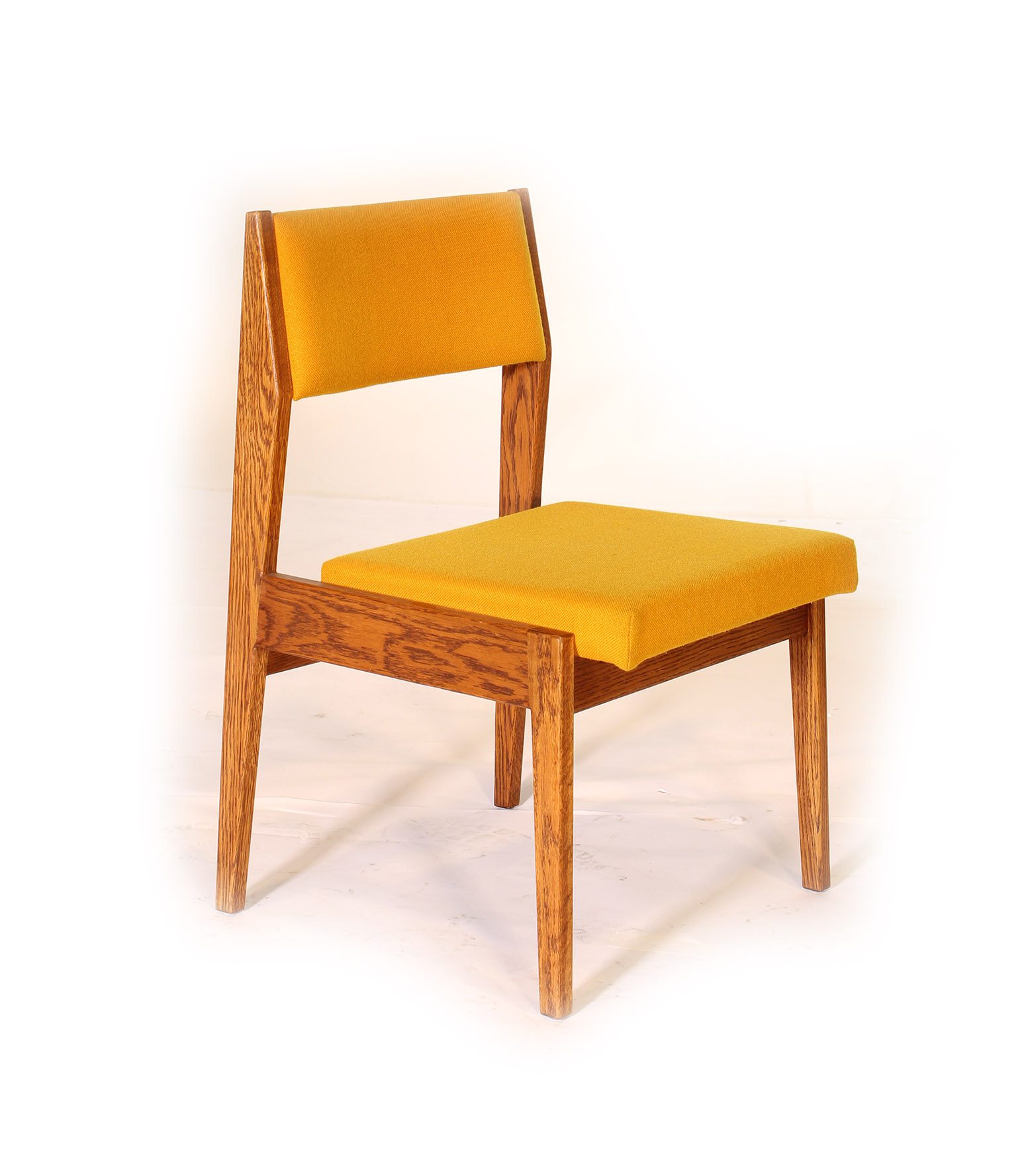 Set of four authentic Jens Risom side chairs in oak. In good shape all around, wear is commensurate with age. Fabric could do with a cleaning or reupholstering. Foam has not disintegrated however it is a little worn at the tops. Seat height measures 17 1/2″, overall height measures 31 1/4″, width measures 20 3/4″ and depth measures 21″.